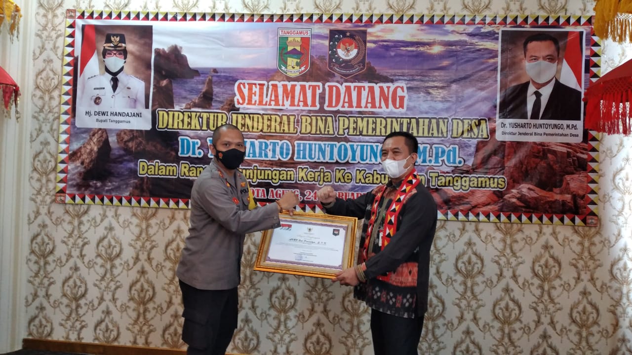 Terkait hal itu juga, Kapolres Tanggamus AKBP Oni Prasetya, SIK turut menerima piagam yang ditandatangani Dirjen Bina Pemdes Kemendagri Dr. Yusharto Huntoyongo atasnama Menteri Dalam Negeri Republik Indonesia.