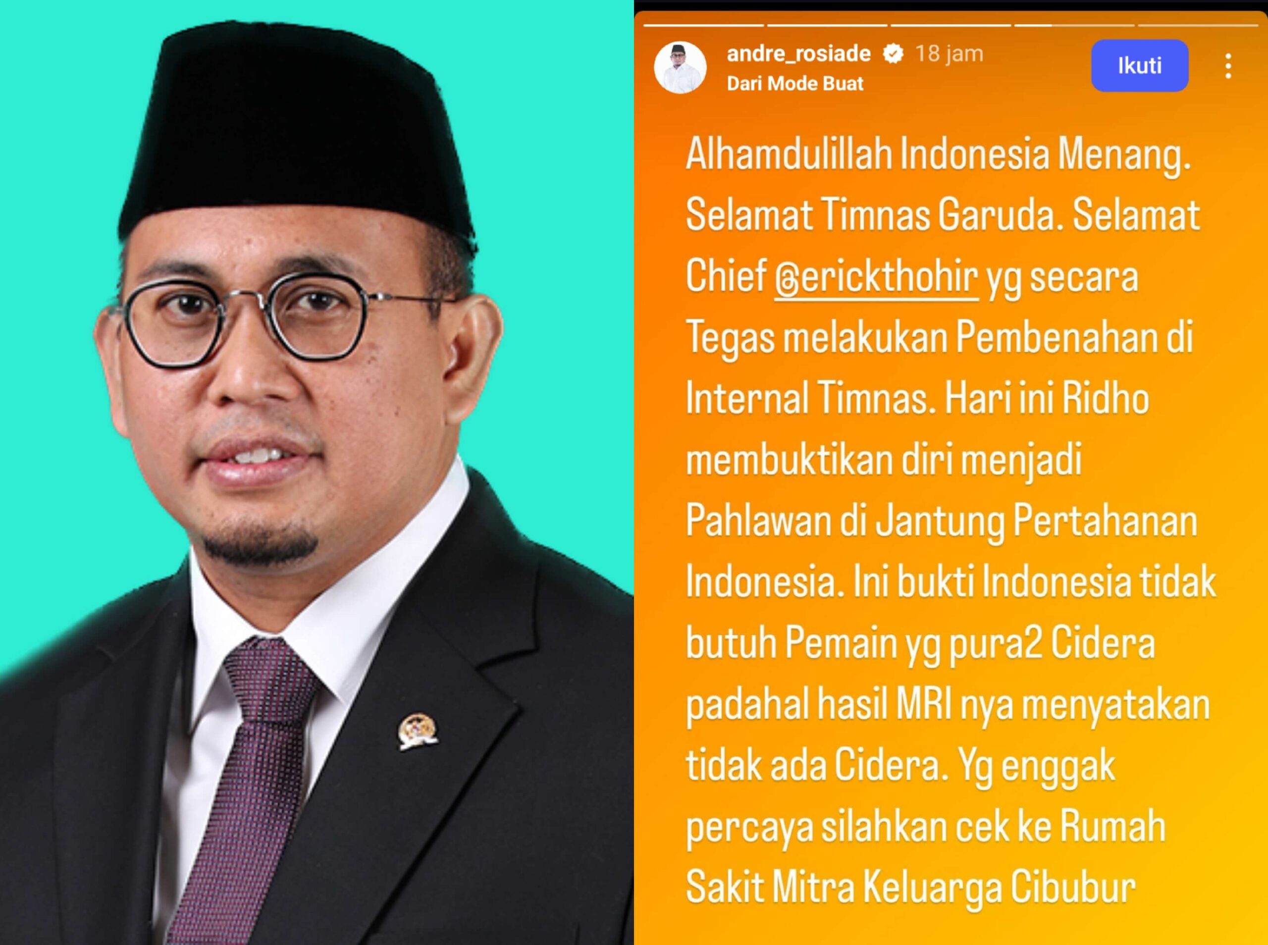Lidik.id, Jakarta – Timnas Indonesia mencatat kemenangan penting atas Bahrain dengan skor tipis 1-0. Kemenangan ini disambut hangat oleh berbagai pihak, termasuk politisi sekaligus Ketua DPD Gerindra Sumatera Barat, Andre Rosiade. Dalam unggahan Instagram-nya, Andre mengapresiasi langkah Ketua Umum PSSI Erick Thohir dalam melakukan pembenahan internal Timnas.